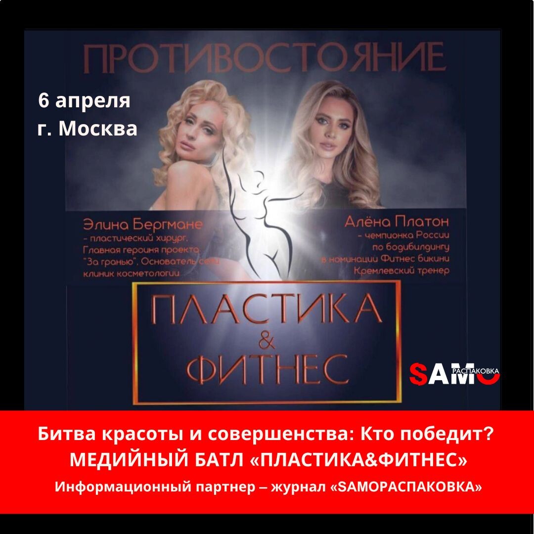 Дорогие читатели! 6 апреля в 12:00 в Москве на площадке STILL STANDUP MOSCOW пройдет уникальное событие – Медийный батл «Пластика & Фитнес», где вы сможете увидеть столкновение двух миров: пластической хирургии и фитнеса. Это мероприятие станет настоящим праздником для тех, кто стремится к самосовершенствованию и хочет разобраться в современных методах достижения красоты и здоровья. Наш журнал «SAMOРАСПАКОВКА» выступает информационным спонсором этого мероприятия, и мы рады пригласить вас на это увлекательное событие, которое поможет вам сделать осознанный выбор на пути к вашему идеальному образу. На арене встретятся два выдающихся эксперта: 💉 Элина Бергмане – именитый пластический хирург, создающий мгновенные преображения 👸Главная героиня проекта «За гранью» ❤️🔥Более 15 лет в медицине 👩⚕️3000+ довольных пациентов 💅Основатель сети салонов красоты 🏥Открыла свою клинику пластической хирургии в Москве 🏋️♀️ Алена Платон – титулованный фитнес-тренер, воплощающая силу и гра