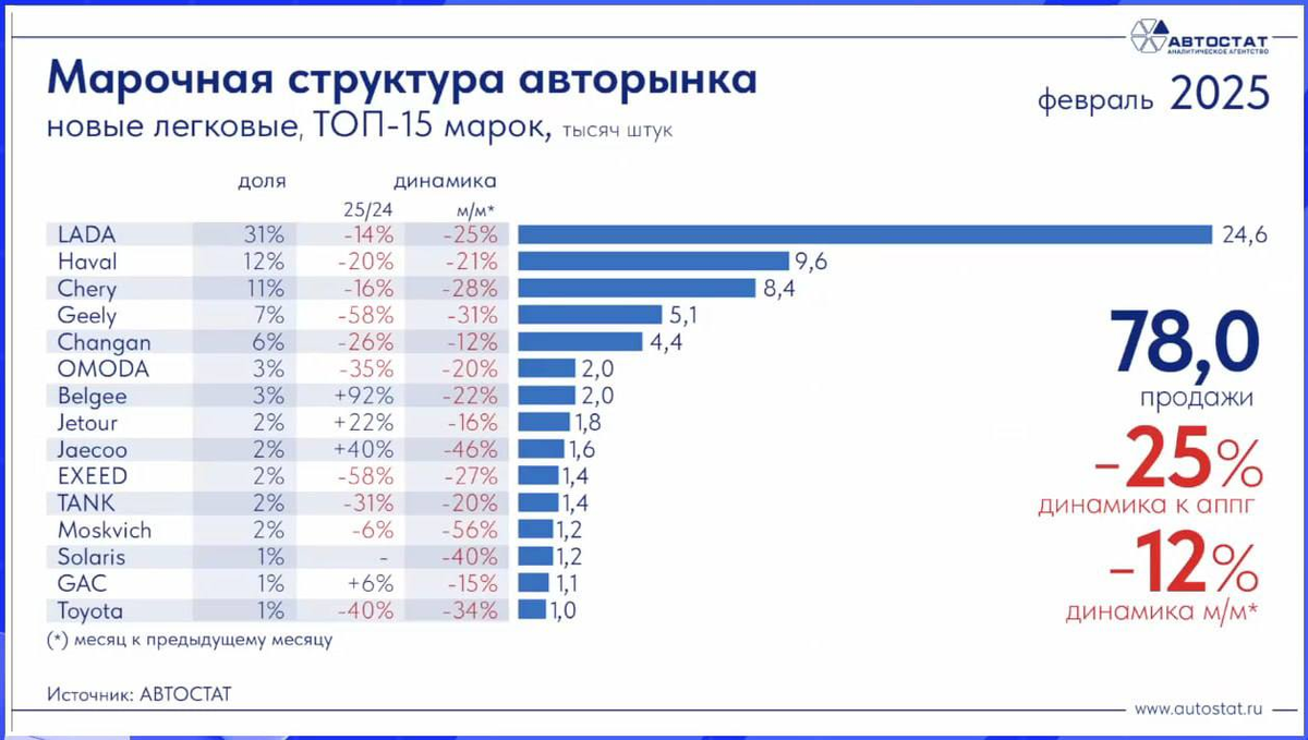 Итак, февраль 2025 года, Россия. Агентство «Автостат» выдало свежие данные: из топ-15 самых популярных автомобильных марок в стране одиннадцать — китайские. Это уже не просто тренд, это настоящая экспансия! Chery, Haval, Geely, Changan — эти ребята, похоже, решили, что российский рынок теперь их второй дом. И не только они: в списке ещё куча знакомых и не очень имён из Поднебесной. Но это ещё не всё. В топ-15 затесались Belgee и «Москвич». На первый взгляд, звучит как что-то родное, правда? Только вот под капотом у них — китайские машинокомплекты. Belgee — это, по сути, перелицованные Geely из Беларуси, а «Москвич» — старый бренд с новой начинкой от JAC. Так что даже эти «местные» герои — часть китайской волны. Получается, из пятнадцати лидеров тринадцать так или иначе связаны с Китаем. Как тебе такой поворот? Теперь к цифрам. Февраль — месяц короткий, и продажи, видимо, решили это отразить. Абсолютно все марки из топ-15 просели по сравнению с январём 2025-го. Ну, тут можно понять: пос