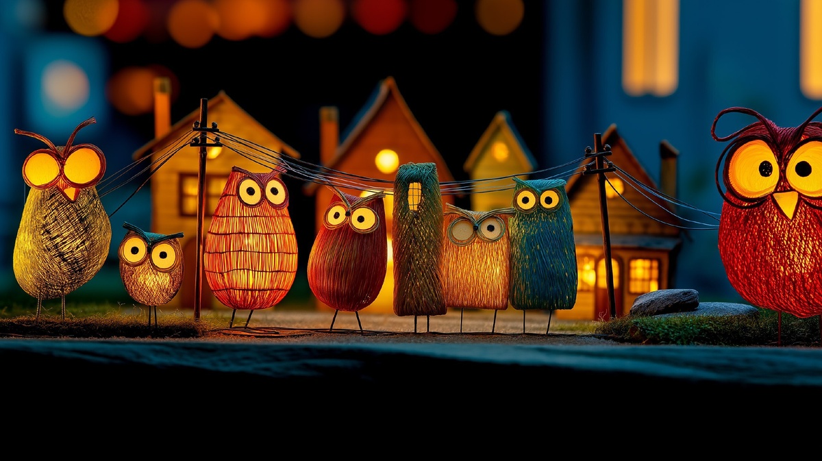 Создано на основе запроса: small village with fiber optic floral owls walking around