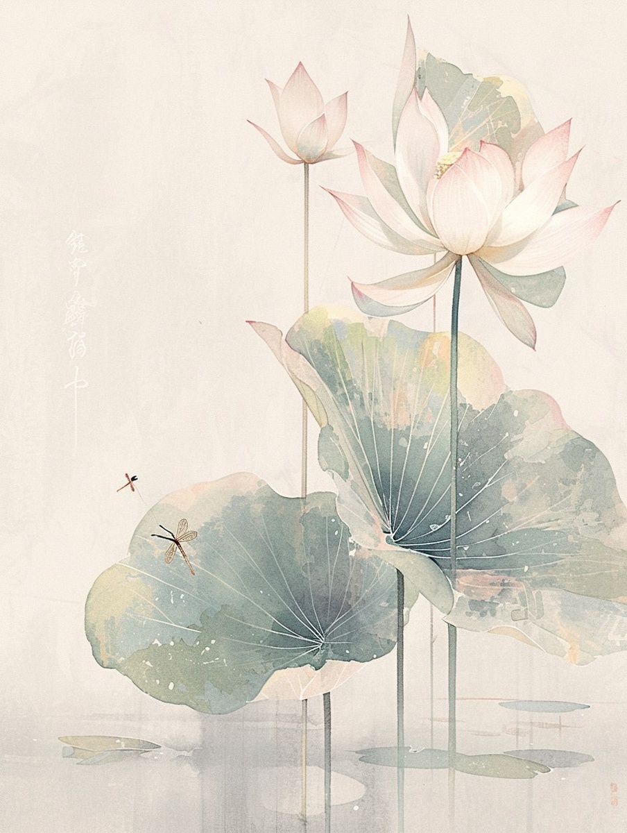 Создано на основе запроса: Traditional Chinese ink painting, one large lotus leaf on the left, a half lotus leaf in the upper right, a blooming lotus flower between them with a dragonfly resting on the petal. Quiet lake surface filled with lotus leaves, elegant and poetic atmosphere. Soft ink wash textures, warm green and pink tones, large blank spaces, refined watercolor style. Gentle lighting, no pavilion, no mountains.