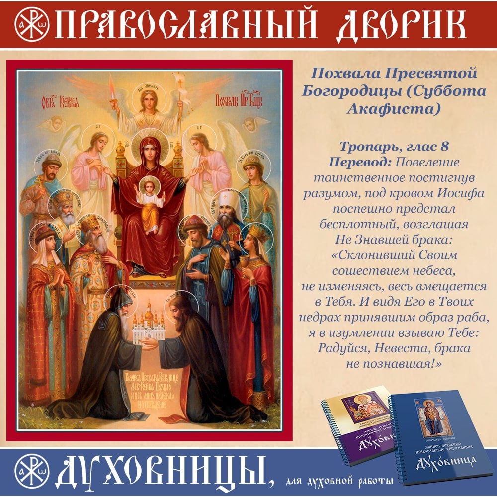 😌 субботу на пятой неделе Великого поста святая Церковь торжественно возглашает молебное пение акафиста, или благодарственной похвалы Пресвятой Богородице. Вследствие этого и сам праздник называется «Похвала Пресвятой Богородице»; данное название используется уже в древнерусских летописях.