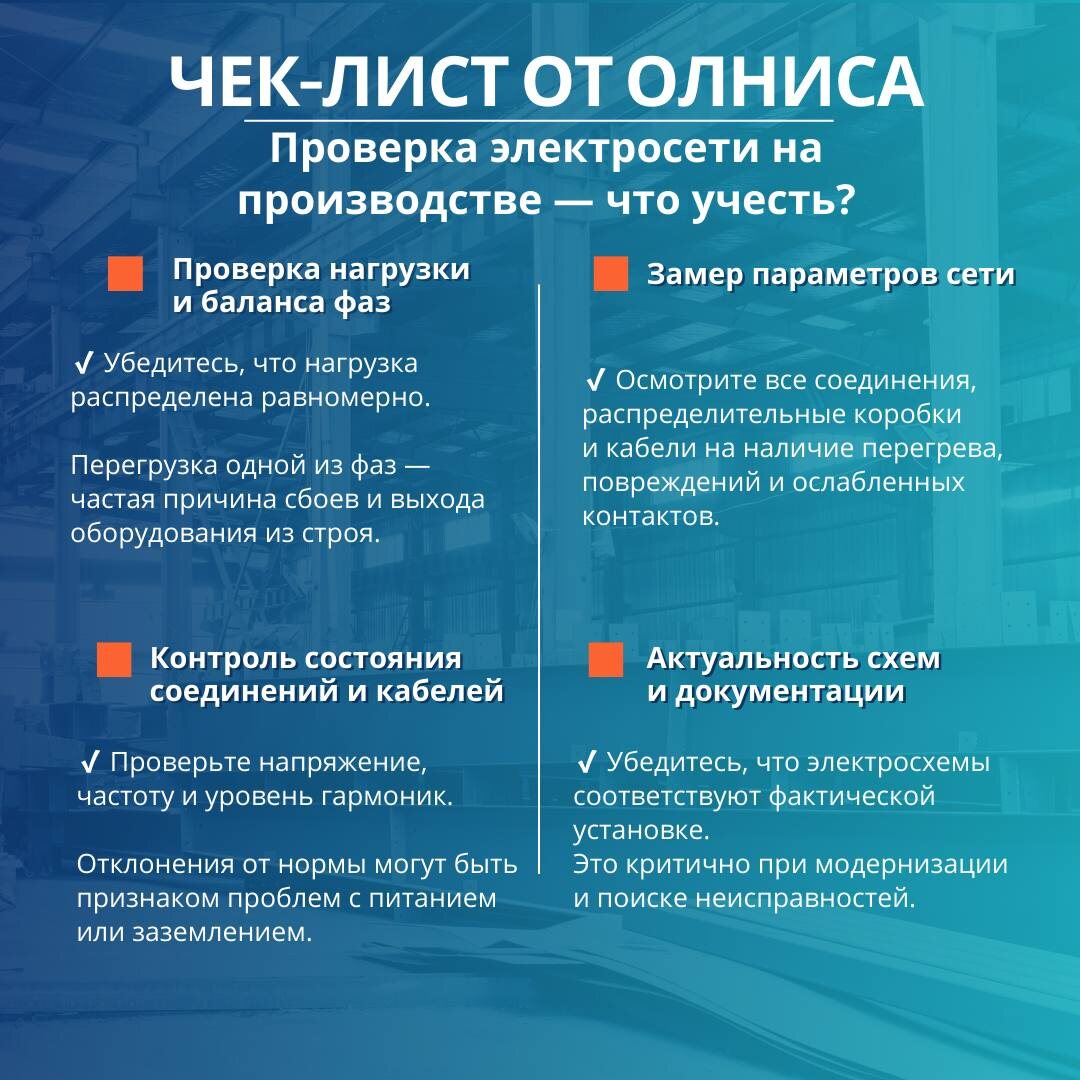 🔌 Электросеть — это фундамент производственного оборудования. Но даже мелкие неполадки в питании могут обернуться большими потерями, от простоя линии до выхода из строя дорогостоящих компонентов. Чтобы этого избежать, мы подготовили чек-лист, который поможет быстро оценить состояние электросети на производстве. ⚒️ Если вам нужно оборудование для модернизации электросети — в Олниса найдётся всё: от реле до промышленных контроллеров. 📦 При возникновении вопросов или необходимости помощи с подбором оборудования — наши эксперты всегда на связи: 📧 zapros@olnisa.ru 📞 8 (800) 333-19-59 #ПромышленнаяАвтоматизация #Олниса #Электроснабжение #ИнженерныеСоветы #ЧеклистПроизводство