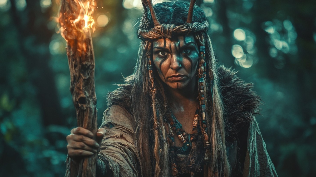 Создано на основе запроса: fantasy illustration of an evil necromancer female wearing shaman like old clothes with a wood carved staff, make