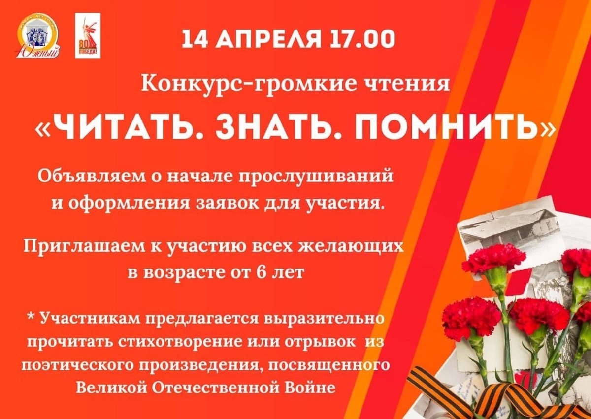 ✨ Дорогие друзья! 🌟 С радостью объявляем о начале прослушиваний и приёма заявок на конкурс громких чтений «Читать. Знать. Помнить»🎤✨ Приглашаем всех желающих от 6 лет принять участие в этом замечательном событии! 📢Чтобы стать участником, просто подготовьте выразительное чтение стихотворения или отрывка из поэтического произведения, посвященного Великой Отечественной войне. Победители получат дипломы и возможность участвовать в программах, приуроченных к Дню Победы. 🇷🇺💖 По всем вопросам обращайтесь к художественному руководителю. Ждём ваших заявок!♥️ 📆 14.04.2025🕒17:00 🏢 Городской дом культуры «Южный» 📍 г.о.Домодедово, мкрн.Барыбино, ул.Южная, стр1А ✅ Мероприятия Домодедово https://dzen.ru/id/66f10385cc4c5a16f7b5fb02 http://vk.com/domodedovo_events http://dzen.ru/domodedovo_events