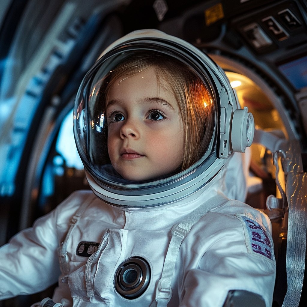 Создано на основе запроса: a girl kid (about six years old) dressed like an astronaut inside a spaceship