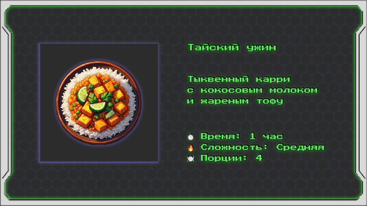 Тайский ужин Тайский тыквенный карри с кокосовым молоком и жареным тофу Этот рецепт представляет собой креативную интерпретацию традиционного тайского карри. Вместо мяса используется нежный жареный тофу, а сладкая тыква добавляет блюду мягкую текстуру и естественную сладость. Блюдо подается с ароматным рисом джасмин, что делает его идеальным для сытного ужина. Информация о рецепте: ⏱️ Время: 1 час 🔥 Сложность: Средняя 🍽 Порции: 4 Ингредиенты: Для карри: • 🎃 Тыква (нарезанная кубиками) — 300 г • 🍴 Тофу (нарезанный кубиками) — 200 г • 🥛 Кокосовое молоко — 400 мл • 🌶 Паста красного карри — 2 столовые ложки • 🫒 Растительное масло — 2 столовые ложки • 🌿 Лемонграсс (мелко нарезанный) — 1 стебель • 🍋 Листья каффир-лайма — 3 штуки • 🌿 Корень имбиря (натёртый) — 1 чайная ложка • 🧂 Соль — по вкусу Для жареного тофу: • 🍴 Тофу (нарезанный кубиками) — 200 г • 🫒 Растительное масло — 2 столовые ложки • 🌶 Паприка молотая — 1 чайная ложка Для подачи: • 🌾 Рис джасмин (варёный)