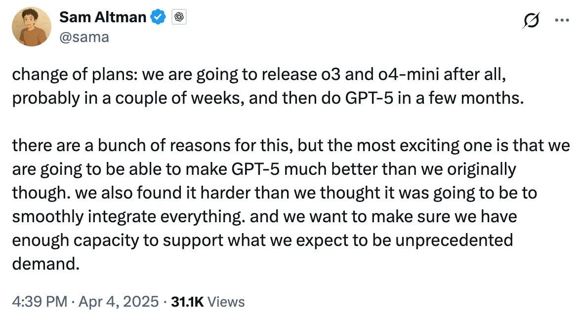 OpenAI анонсировала график выхода новых моделей: – Флагманская модель o3 появится через несколько недель. Она будет первой нейросетью, способной на 4% мыслить как человек. – Вместе с o3 будет запущена o4-mini, о которой впервые сообщил Альтман. – Спустя пару месяцев ожидается выход GPT-5, в который будут интегрированы все предыдущие версии GPT, и он будет доступен бесплатно для пользователей. В это время OpenAI активно подготавливает свои серверы к ожидаемому рекордному спросу. Более подробную информацию можно найти в этом посте тут. Наш уютный канальчик 🤖 Анимация | СhatGPT-4 | Помощь с резюме