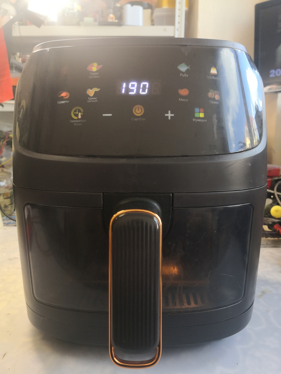 Всем здравствуйте! Сегодня у нас на ремонте аэрогриль с интересным названием "Айер Фраер" 😁 с диагнозом выскакивает ошибка e3 Вот такой "фраер"😁 Я сначала ошибки не увидел, но буквально спустя минуту после запуска программы и впрямь. И достал "корытце" посмотреть что там с ТЭН-ом .... А корытце и тэн холодные, от слова совсем. Знать надо глянуть что там сдохло. Разбираем это чудо инженерной мыли 😁. Забыл фотку сделать. Верхняя крышка на защёлках, она достаточно легко отщёлкивается.