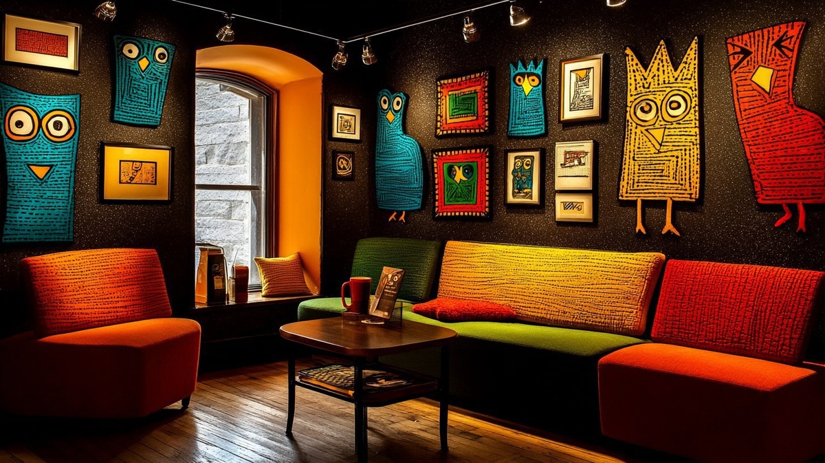 Создано на основе запроса: a boutique coffe shop decorated like fiber optic floral owls by picasso with throw pillows, art on the wall and
