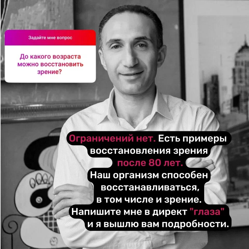 Глаза – один из самых важных органов чувств, с помощью глаз мы получаем до 90% информации. И от их правильной работы зависит качество нашей жизни, способность трудиться и обслуживать себя. К сожалению, глаза очень уязвимы, и пренебрегать заботой о них точно не стоит. ✅Как же поддержать здоровье глаз? Как избавиться от поставленных диагнозов по зрению? Как видеть мир вокруг без напряжений и искажений для радостной и комфортной жизни? Меня зовут Карен Петросян, и уже более 20 лет я помогаю людям восстанавливать зрение. Суть моего метода в комплексном подходе по улучшению работы всего организма и зрения в частности. Мы не рассматриваем глаза, как отдельный орган, в нашем организме все взаимосвязано. ✔️Главный аспект для восстановления зрения – это правильная техника выполнения упражнений и их корректная последовательность по моей методике. Разные упражнения можно найти и в интернете, но такой методики и подхода там точно нет. Поэтому я создал онлайн центр по восстановлению зрения, чтобы л