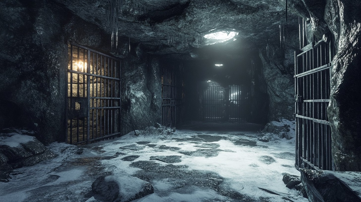 Создано на основе запроса: cinematic realistic photo of winter cave with prison cells inside the tunnles, moody, dank