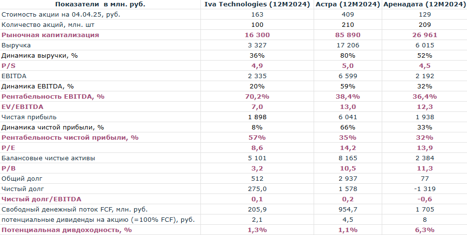 3 апреля вышел отчет МСФО ПАО Ива за 2024 год. Котировки встретили его 5% падением. Что же разочаровало инвесторов? Помимо Ивы за 2024 год отчитались Астра (ASTR) и Аренадата (DATA). И среди них ПАО Ива выглядит хуже по динамике выручки, EBITDA и чистой прибыли. Более того, если исключить разовый фактор у Астры - приобретение штаб-квартиры за 1,8 млрд. руб. в 2024 году, то IVA имеет самую низкую потенциальную дивдоходность по величине свободного денежного потока - 1,3% по сравнению с 3% у Астры и 6,3% у Аренадаты. А если оценить справедливую стоимость Ивы по свободному денежному потоку, то она не превышает 52 рубля. Внимательный читатель может заметить, что у Ивы самая высокая маржинальность в секторе - рентабельность EBITDA превышает 70%, а рентабельность чистой прибыли - 57%. Но есть нюанс. Из 1,7 млрд. руб. чистого денежного потока от операционной деятельности 1,5 млрд. руб. тратится на создание и приобретение нематериальных активов. Казалось бы, это хорошо! Компания практически всю