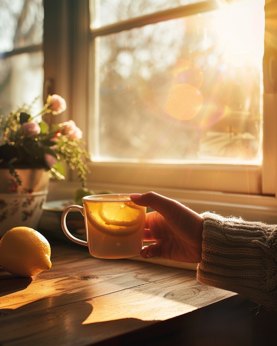 Автоперевод: Мирная утренняя сцена, рука с чашкой теплой воды с медом и лимоном, солнечным светом, сияющим через окно, деревянный кухонный стол, спокойный и уютная атмосфера, ультрареалистичный стиль фотографии жизни, стиль жизни