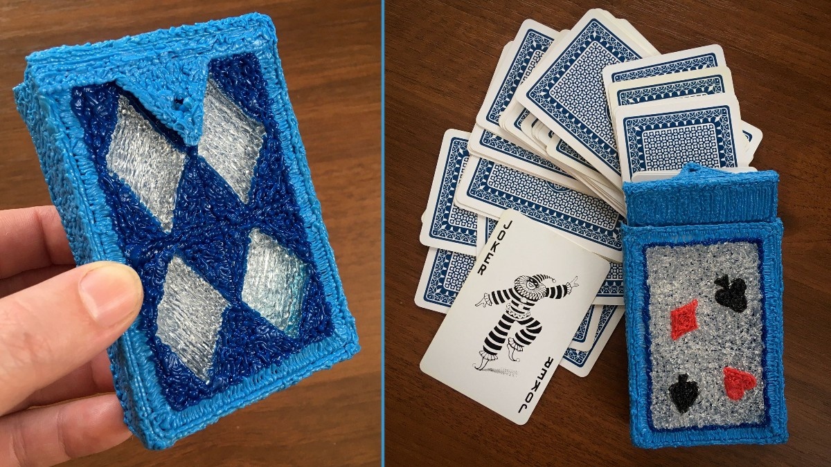 Как иногда нужна небольшая коробочка определённых размеров, под конкретную вещь… А мы возьмём да нарисуем! У меня случилось так, что игральные карты остались без футляра. Во что же их положить? Попробовала коробочку из-под мыла, пакетик, мешочек – всё не то! Тогда взялась за 3d-ручку. Цвета пластика для основы футляра выбрала в бело-синей гамме, чтобы гармонировали с рубашкой набора карт. Добавила бесцветный для полупрозрачного окошка и контрастные красный, чёрный для украшения. Сделала выкройки стенок футляра с припусками около 5 мм по каждому размеру. Нарисовала 3d-ручкой две основные большие стенки футляра, две длинные боковые и две короткие боковые. Соединила все стенки кроме одной короткой боковой в коробочку. Дальше самое интересное – крышка. Она крепится к коробочке по принципу дверных петель. Надо на крышке (оставшейся пока не присоединённой боковой стенке) нарисовать несколько петелек, продеть в них кусочек пластика и закрепить его концы вверху коробочки. Крышка получилась под