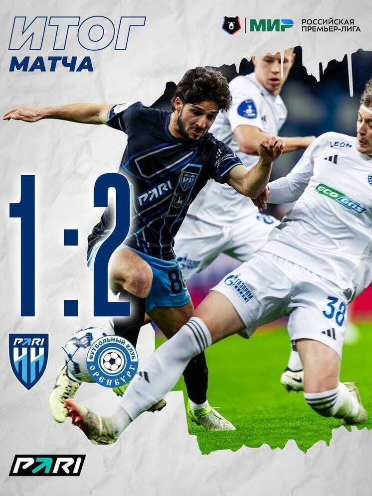 В матче-открытии 23-го тура МИР РПЛ футболисты «Пари НН» уступили «Оренбургу» на своем поле. Счет - 1:2. Единственный гол в составе подопечных Виктора Ганчаренко забил уругвайский нападающий Тьяго Весино, реализовав 11-метровый удар. «Пари НН» продолжает серию поражений, не побеждая уже 4 матча подряд. В следующем туре «Пари НН» примет московское «Динамо» на своем поле. 12 апреля в 14:30.