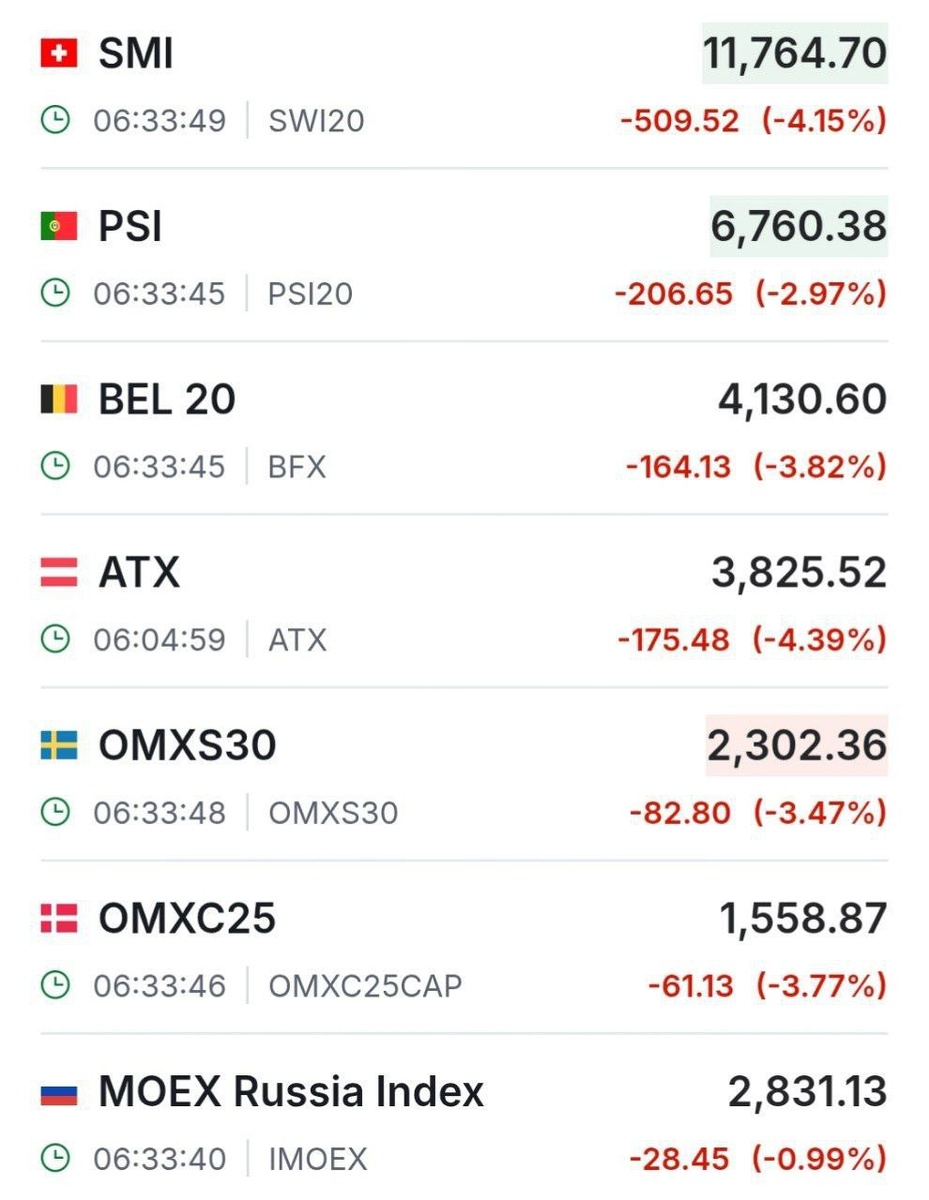 В Европе продолжается обвал акций из-за пошлин Трампа.
