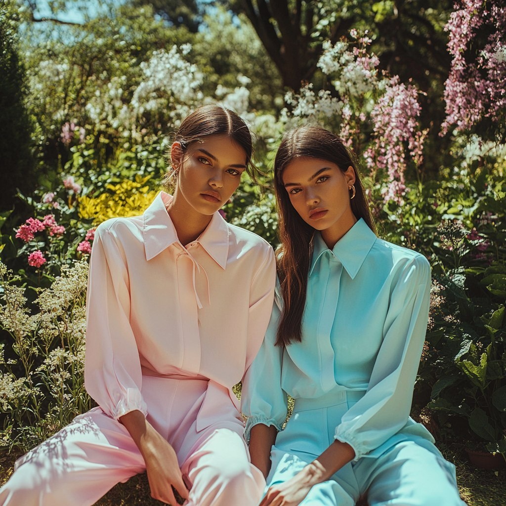 Создано на основе запроса: Two Mexican models, dressed in modern, minimalist pastel-colored clothing, pose naturally in a garden
