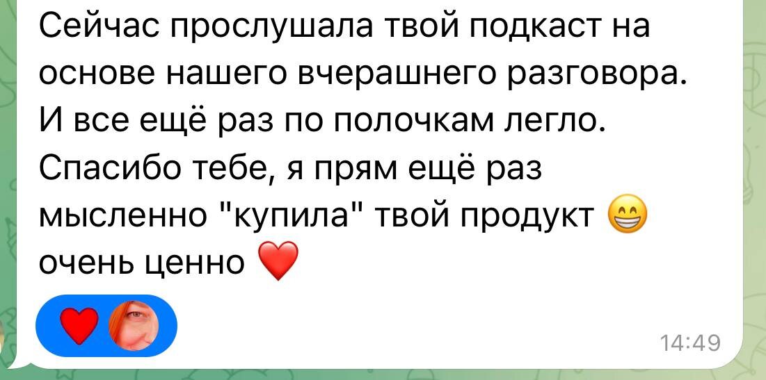 «Спасибо тебе, я прям ещё раз мысленно "купила" твой продукт 😁 очень ценно