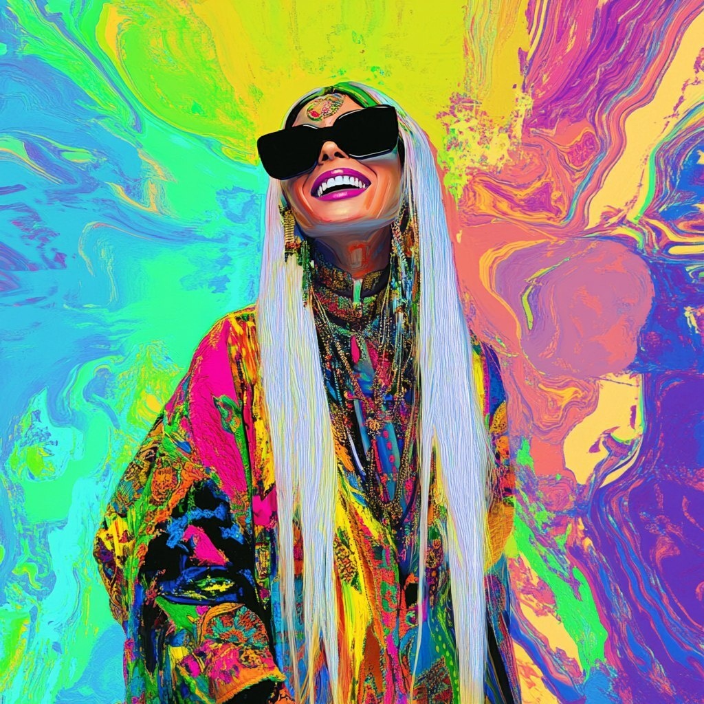 Создано на основе запроса: à pop art abstract design with fluo colors where a woman stand with a traditional occidental costume and some piercing smiling like a prince wearing black glasses , long white hair and spiritual feelings only with forms and pastel colors totally abstract pop art on the background --- Автоперевод: Абстрактный дизайн поп -арта с цветами Fluo, где женщина стоят с традиционным западным костюмом и некоторыми пирсинными, улыбающимися, как принц в черных очках, длинные белые волосы и духовные чувства только с формами и пастельными цветами. Полностью абстрактный поп -арт на заднем плане Хорошо получилось? 🤔 https://dzen.ru/id/65c0c65c86e4f837c27b24d7 #ИИ #AI #нейросеть #midjourney #art