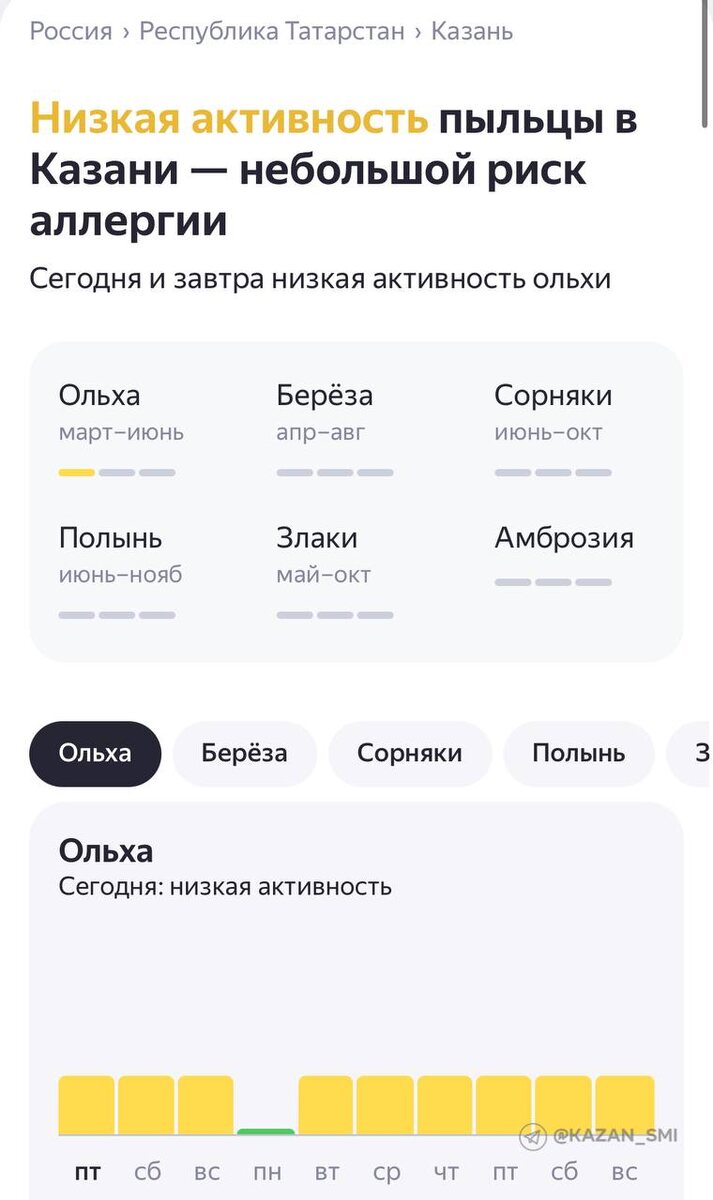 🤧 Уровень активности пыльцы ольхи повысится в Казани Сейчас уровень активности низкий, а вот далее наблюдается повышение. #город@kazan_smi Аллергики, держимся! 👍 Подписаться на канал БЕСПЛАТНЫЙ РОЗЫГРЫШ