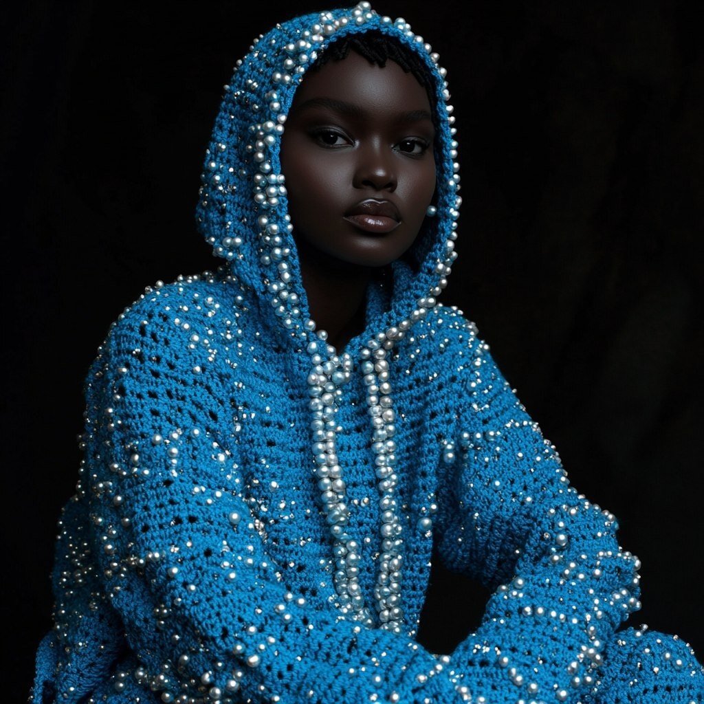 Создано на основе запроса: full body shot, A blue crochet pearl hoodie, made of pearls on a beautiful black female model --- Автоперевод: Снимк для всего тела, синяя толстовка для жемчуга, сделанная из жемчуга на красивой черной женской модели Хорошо выглядит? 🤔 https://dzen.ru/id/65c0c65c86e4f837c27b24d7 #ИИ #AI #нейросеть #midjourney #art