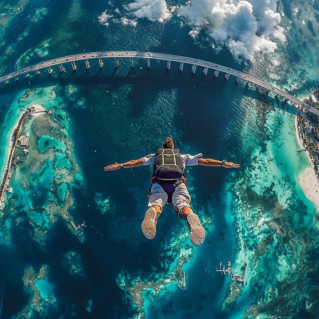Создано на основе запроса: a skydiver falling from the sky looking down at the 7 mile bridge in key west Florida