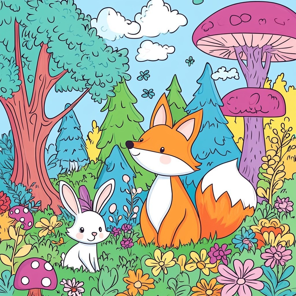 Создано на основе запроса: A colorful forrest with its animals children's coloring book cover, featuring a big fox and a small rabbit