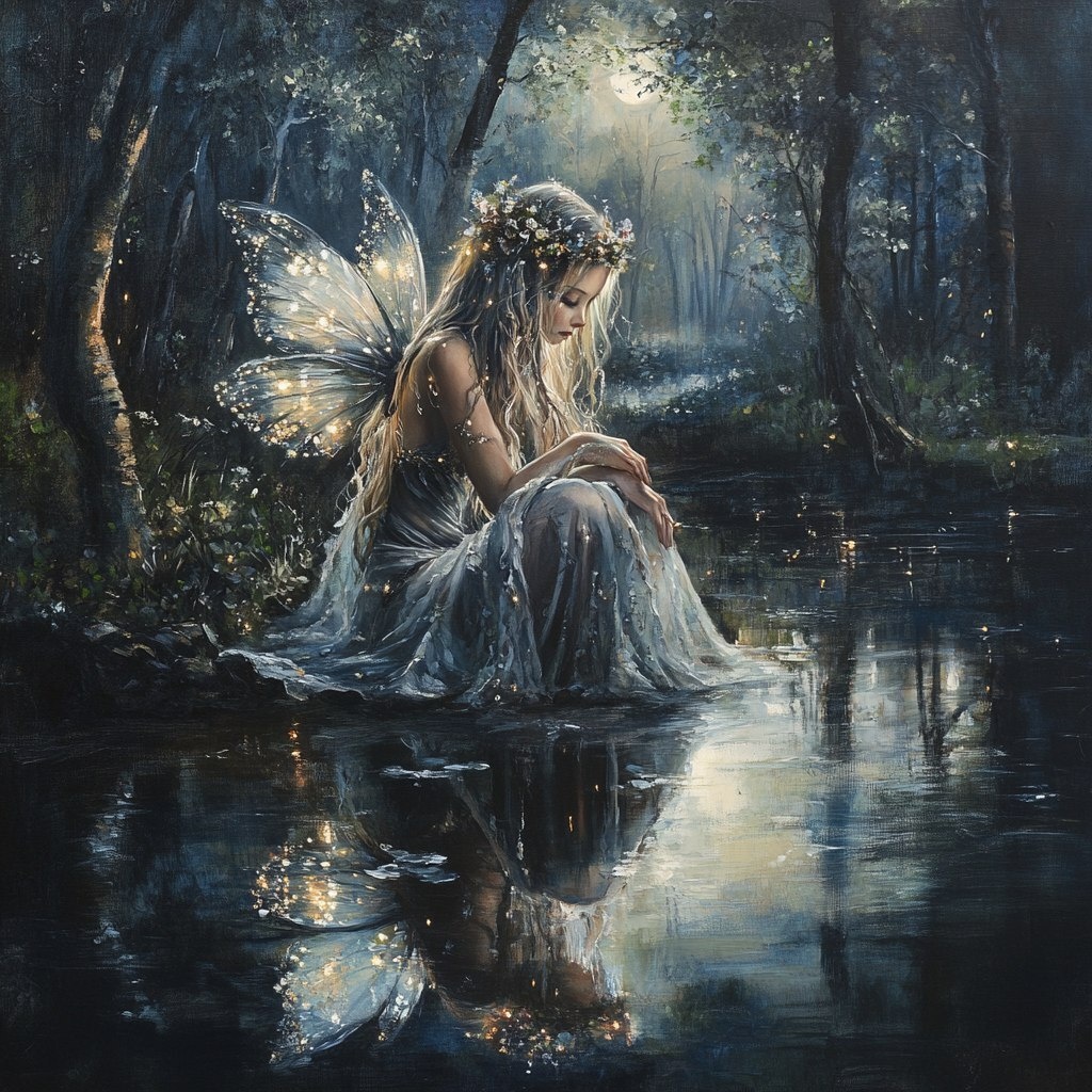 Создано на основе запроса: Medieval oil painting of a fae woman with delicate, iridescent butterfly wings sitting gracefully by a tranquil forest pond. Moonlight filters through the ancient trees, casting a soft glow on her luminous skin and flowing, silver-threaded hair. Dressed in ethereal gossamer adorned with wildflowers, she gazes at her reflection in the still water, her glowing eyes filled with mystery. Ripples distort the image as fireflies dance around her, and the enchanted forest hums with quiet magic. --- Автоперевод: Средневековая масляная живопись женщины -фей с деликатными, переливающимися крыльями бабочки, изящно сидящих спокойным лесным прудом. Красиво получилось? 🤔 https://dzen.ru/id/65c0c65c86e4f837c27b24d7 #ИИ #AI #нейросеть #midjourney #art