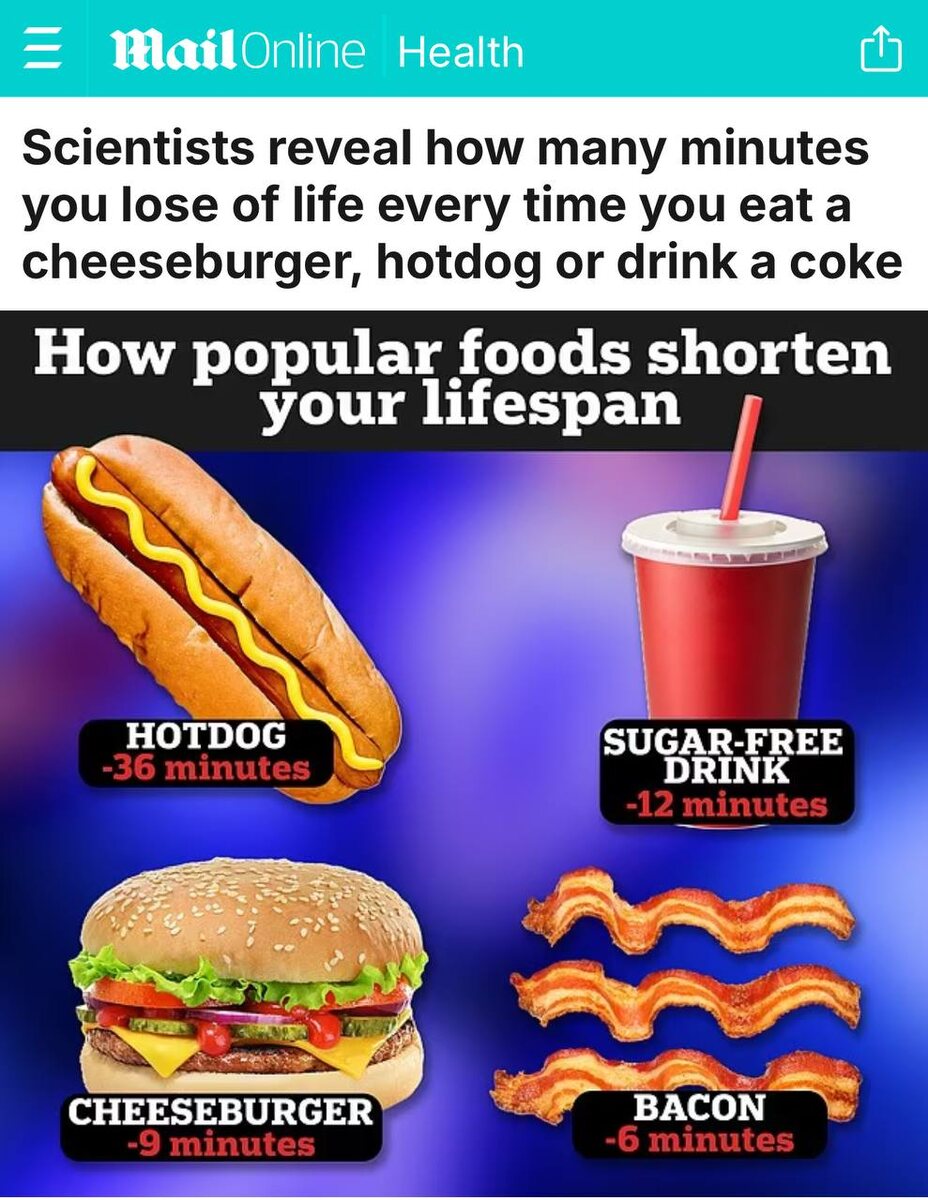 🍔 Стакан колы уменьшает вашу жизнь на 12 минут, а хот-дог на 36 минут — ученые.