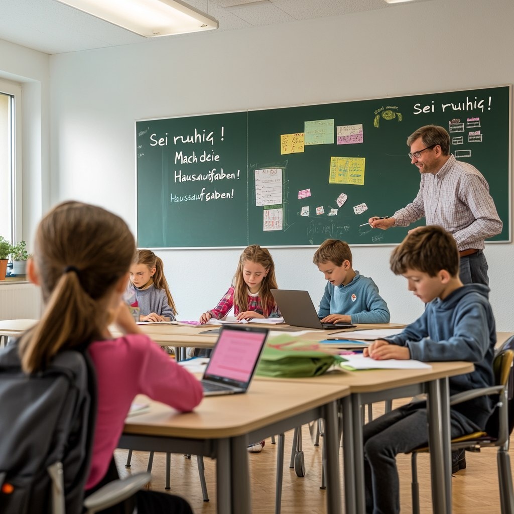 Создано на основе запроса: A realistic classroom with students and a teacher: one student is writing on the blackboard, another is using a laptop, another reading a book, teacher helping two students, German language posters on the wall with phrases like "Sei ruhig!" and "Mach die Hausaufgaben!", natural indoor lighting, real people, candid school photo, photorealistic, shot with Canon EOS 5D, 50mm lens, f/2.0, ISO 200 --- Автоперевод: Реалистичный класс со студентами и учителем: один ученик пишет на доске, другой использует ноутбук, другой читает книгу, учитель помогает двум ученикам, немецким языковым плакатам на стене с фразами, такими как «Sei Ruhig!» Неплохо выглядит? 🤔 https://dzen.ru/id/65c0c65c86e4f837c27b24d7 #ИИ #AI #нейросеть #midjourney #art