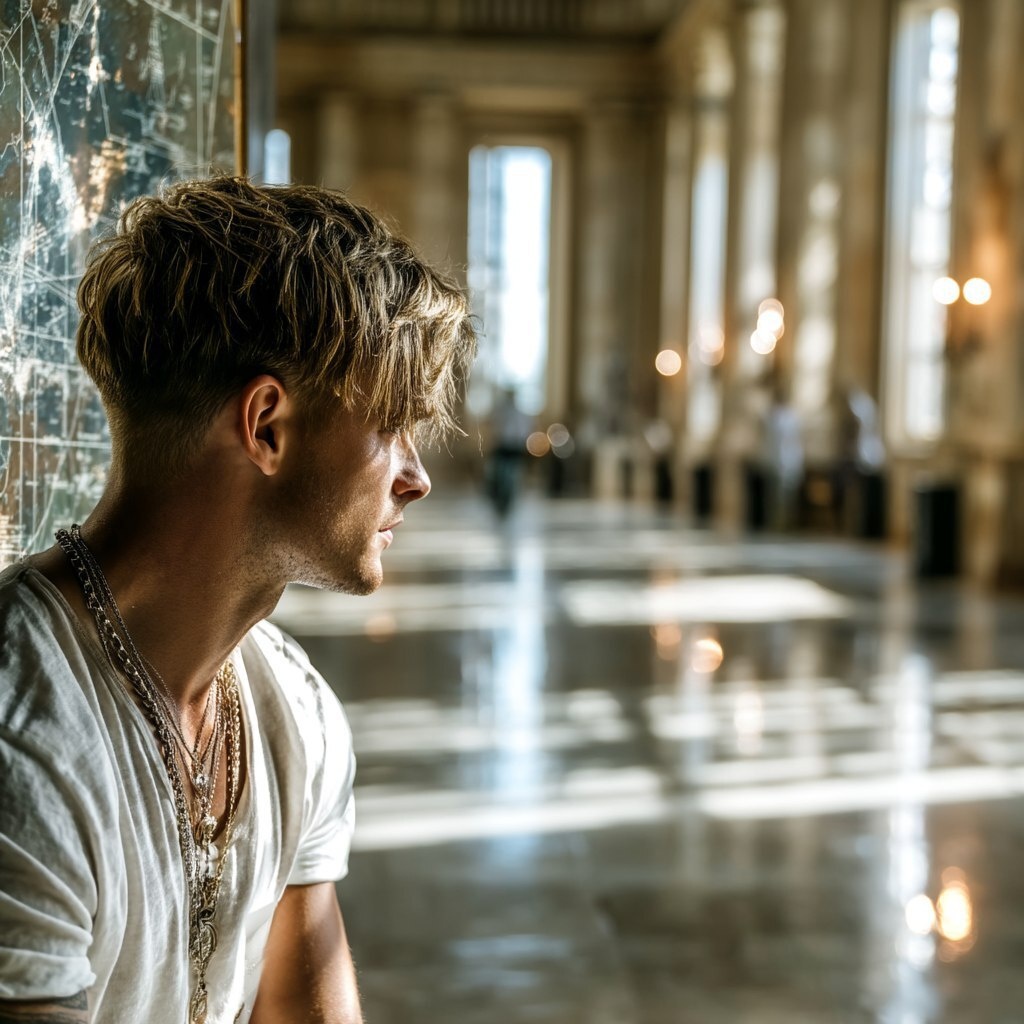 Создано на основе запроса: a young college royal male aesthetically attractive, jersey mop hair style with a skin fade, wearing a white fitness T-shirt, wearing a diamond necklace and diamond bracelets wearing cargo white military pants, a dark blond highlight hairstyles, up close and regal an epic and huge castle