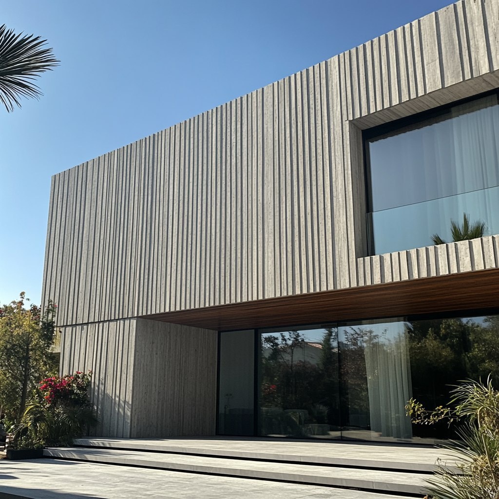 Создано на основе запроса: exterior co-extrusion wall panel, cladding, wood like fluted exterior panels, installed in modern concrete