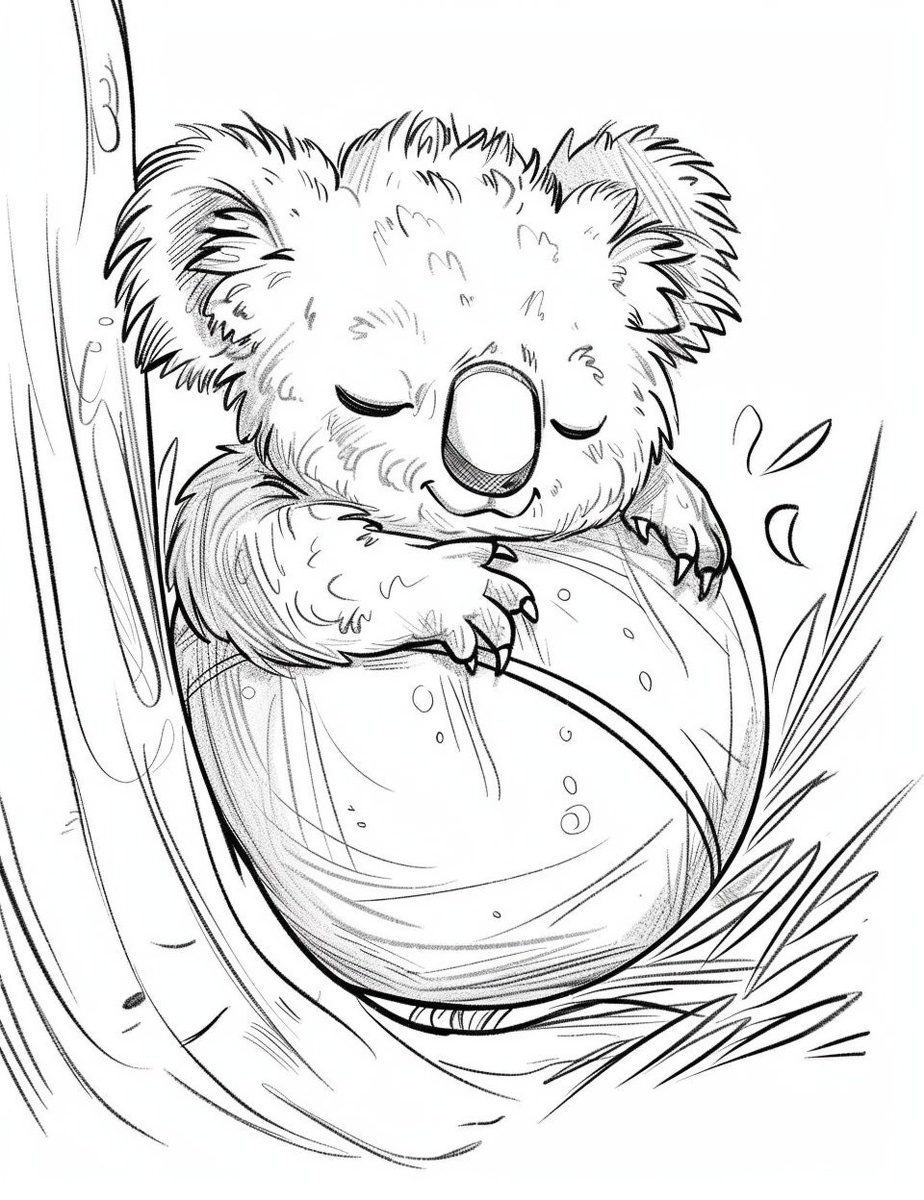 Создано на основе запроса: A simple black-and-white coloring page for toddlers (3 years old) showing a cute cartoon koala waking up in a