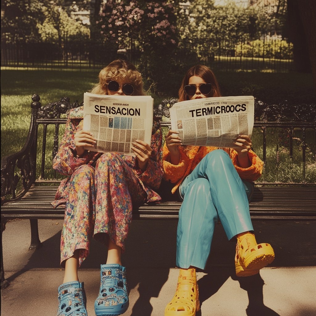Создано на основе запроса: vogue fashion editorial, magazine photography of two young woman sitting on park bench reading newspaper hiding their faces wearing crocs shoes on their feet and fashionable clothes and holding up newspaper with "SENSACIÓN TERMICROCS" written in black text. --- Автоперевод: Редакция моды Vogue, журнальная фотография с двумя молодыми женщинами, сидящей на скамейке парка, чтение газеты, скрывающая свои лица, одетые в туфли Crocs на ногах и модную одежду, и держате газету с «Sensación Termrocs», написанным в черном тексте. Как тебе эта иллюстрация? 🤔 https://dzen.ru/id/65c0c65c86e4f837c27b24d7 #ИИ #AI #нейросеть #midjourney #art