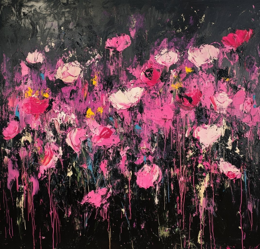 Создано на основе запроса: Abstract painting of wildflowers, with pink and magenta colors on a black background