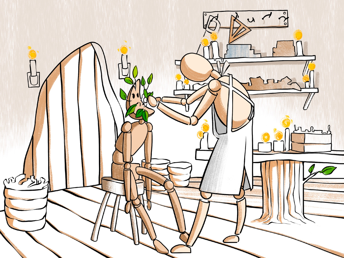 Есть на свете городишко Небывалой красоты. Разноцветные домишки Живописные цветы. Деревянные игрушки Основали быт да лад, И, поэтому их город Носит имя Древоград. Куклы были работяги, Все трудились день за днем, Что-то делали, старались, Занимались ремеслом. Жил среди тех кукол Плотник – Был в почете у других, Так случалось, что однажды Он спасал друзей своих. Если кто-то лгал беспечно, - Видно было по лицу, Вырастали тут же ветви На проклятье подлецу. И тогда лишь только Плотник Мог тем куклам угодить – Аккуратно и тихонько Эти ветви обрубить. И еще снималась стружка, И, чем больше кто-то врал, Тем все больше становился Плоским у лица овал. Был у плотника приятель - Кукла с именем Брусок, От вранья лицо у куклы Было словно желобок. После каждой процедуры, После каждого вранья Все сложнее узнавали По лицу его друзья. Был Брусок ленивым очень, К делу как-то не влекло, Чем бы легоньким заняться? - Не нашел он ремесло. И за что бы он ни взялся, Ничего не подошло, Ведь любое дело, братцы,