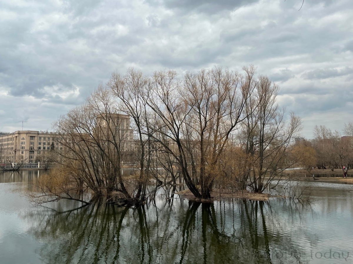 Островок на восьмигранном пруду в Лефортовском парке ранней весной