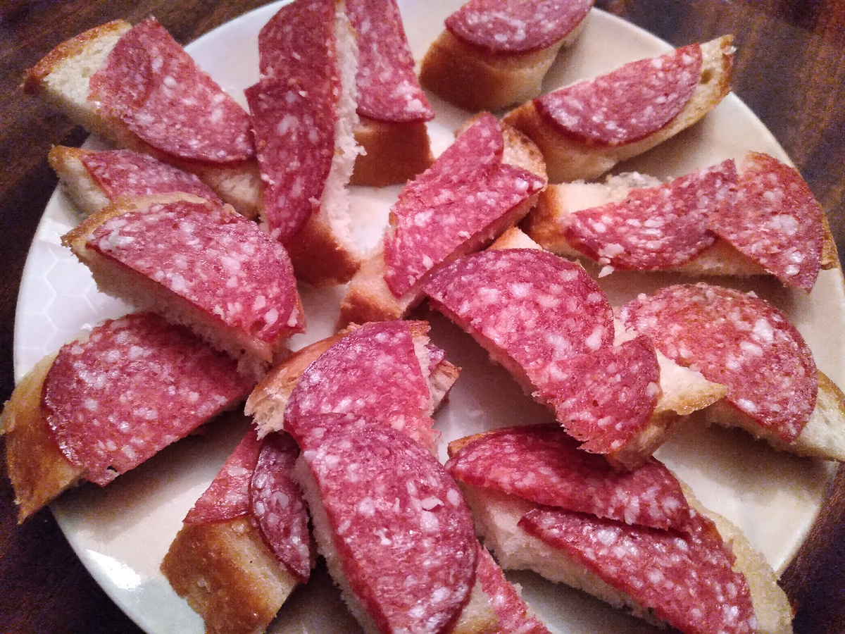 В этом небольшом посте расскажу о моём изобретении, о том, как я многократно улучшил вкус бутерброда с колбасой. И дело не только в том, что я взял белый нарезной батон собственного приготовления, качественное вкусное сливочное масло, сырокопченую колбасу, в данном случае итальянская праздничная, а дело в одном нюансе. Я мелко нашинковал репчатый лук, пожарил его до золотистой корочки на смеси сливочного и подсолнечного масел и в это масло на секунду макал хлеб, а уже сверху можно класть колбасу или майонез, а потом колбасу чтобы было более мягко. Лук очень важно хорошенько прожарить, если не дожарить, мы не получим нужного вкуса, если пережарить, то будет горечь в масле. Хлеб я не поджариваю, а просто на секунду пропитываю маслом, которое впитывает в себя жареный лук, и всё это сделало бутерброд более выразительным, изысканным и гораздо более вкусным. В первый раз я обмакивал просто в масле, без лука, а затем уже лук не вынимал, пропитывал в масле и лук мог прилипать к хлебу, это норм