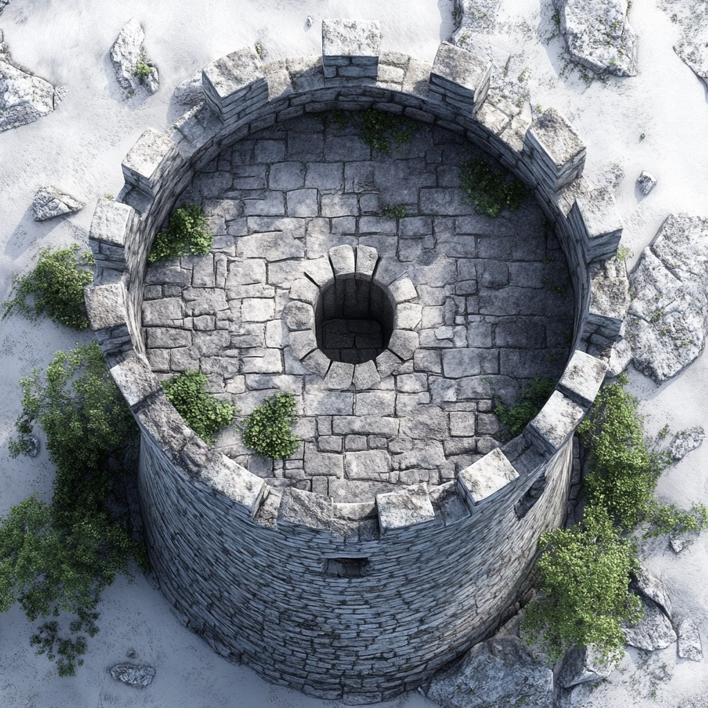 Создано на основе запроса: realistic noon day overhead view of a single round castle tower