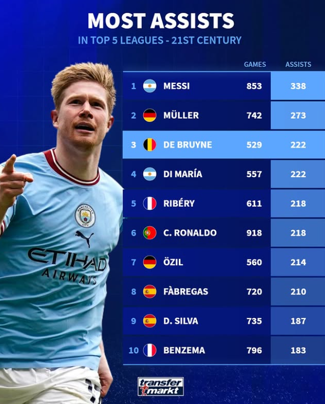 Летом Кевин де Брюйне попрощается с «Манчестер Сити», за который выступал целых 10 лет. По этому случаю Transfermarkt решил вспомнить лучших ассистентов топовых европейских лиг в XXI веке. Кевин в этом почетном рейтинге занял третью строчку: за 529 матчей бельгиец отдал 222 голевые передачи, из них 174 – за «Ман Сити». А лидером стал Лео Месси, на счету которого 338 ассистов за 853 игры. Больше всего он, разумеется, помогал партнерам в «Барсе» – 303 результативные передачи. Вторую строчку занимает Томас Мюллер: 742 матча и 273 ассиста – все в составе «Баварии». Лучшие ассистенты топ-5 лиг Европы в XXI веке «Дорогой Кевин, ты помнишь?» Де Брюйне уходит из «Сити», он уже получил милое предложение от экс-клуба Топ-10 рекордсменов по матчам за единственный клуб. Лишь один футболист до сих пор в строю Фаны «Лос-Анджелеса» поиздевались над Месси на матче с «Интер Майами»: вывесили карикатуру с надписью «Pessi»
