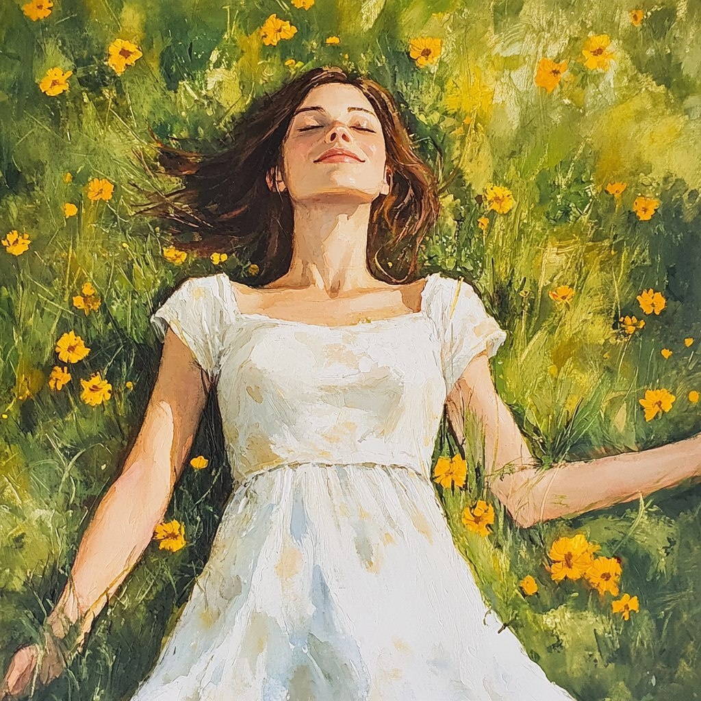 Создано на основе запроса: oil painting/ watercolor of a simplistic middle aged-woman, brunette, wearing a white knee length dress laying down happily in a field of grass, surrounded by yellow flowers, eyes closed and smiling, but she is very tiny and you can barely see her face, there is more view of the meadow than there is of her --- Автоперевод: Живопись маслом/ акварель упрощенной брюнетки со средним возрастом со средним возраста Как тебе это изображение? 🤔 https://dzen.ru/id/65c0c65c86e4f837c27b24d7 #ИИ #AI #нейросеть #midjourney #art
