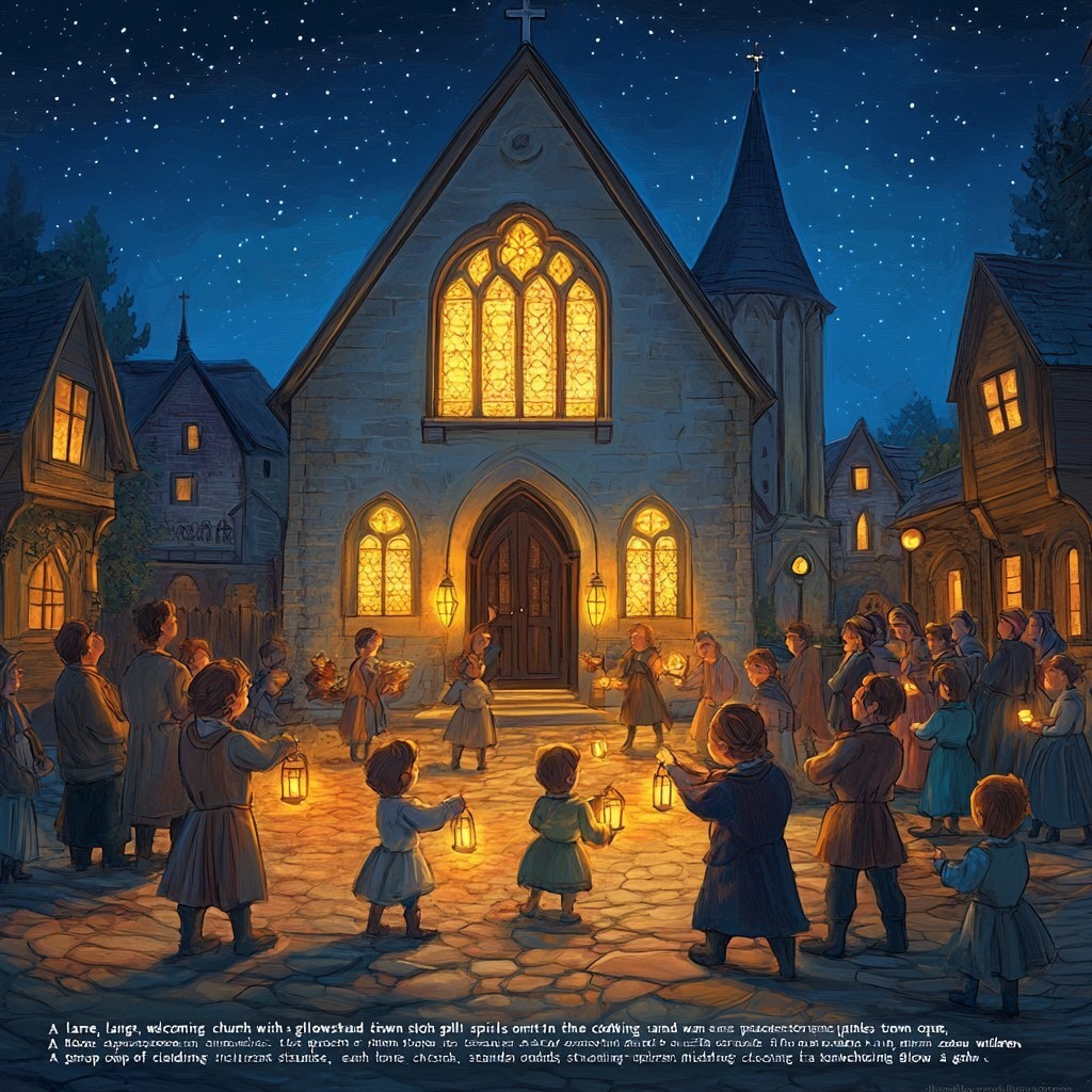 Создано на основе запроса: "A large, welcoming church with glowing stained glass windows, sitting in a peaceful town square. The doors are open, and warm golden light spills onto the cobblestone streets. A group of townspeople, including children, stands outside, each holding a glowing lantern, preparing to gather together. The sky is deep blue with stars twinkling, showing that the storm has passed. The art style is storybook-like, soft, whimsical, painterly, with child-friendly features and gentle warm tones." --- Автоперевод: "Большая, гостеприимная церковь со светящимися витражами, сидящая на мирной городской площади. Двери открыты, и теплые золотые светильны на улицы с булыжником. Круто вышло? 🤔 https://dzen.ru/id/65c0c65c86e4f837c27b24d7 #ИИ #AI #нейросеть #midjourney #art