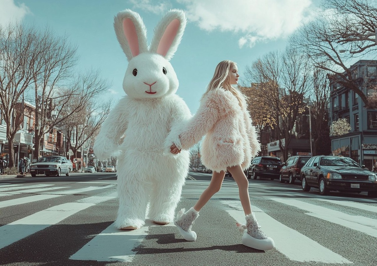 Создано на основе запроса: hyper realistic Photo of the cover page for a magazine, featuring a young woman model in a fluffy winter outfit and CROCS SHOES crossing the street with a giant white bunny character wearing a smiling rabbit mask holding hands with her. The shot is from a front angle, with natural lighting and pastel colors. --- Автоперевод: Гипер реалистичная фотография обложки для журнала с моделью молодой женщины в пушистой зимней одежде и обуви Crocs, пересекающих улицу с гигантским персонажем белого кролика в улыбающейся маске кролика, держащей руки с ней. Неплохо выглядит? 🤔 https://dzen.ru/id/65c0c65c86e4f837c27b24d7 #ИИ #AI #нейросеть #midjourney #art