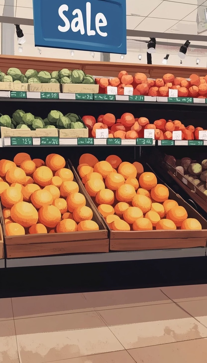 Создано на основе запроса: cartoon, portrait,Fruit and vegetable area with a shelf full of oranges with a sign that says "sale