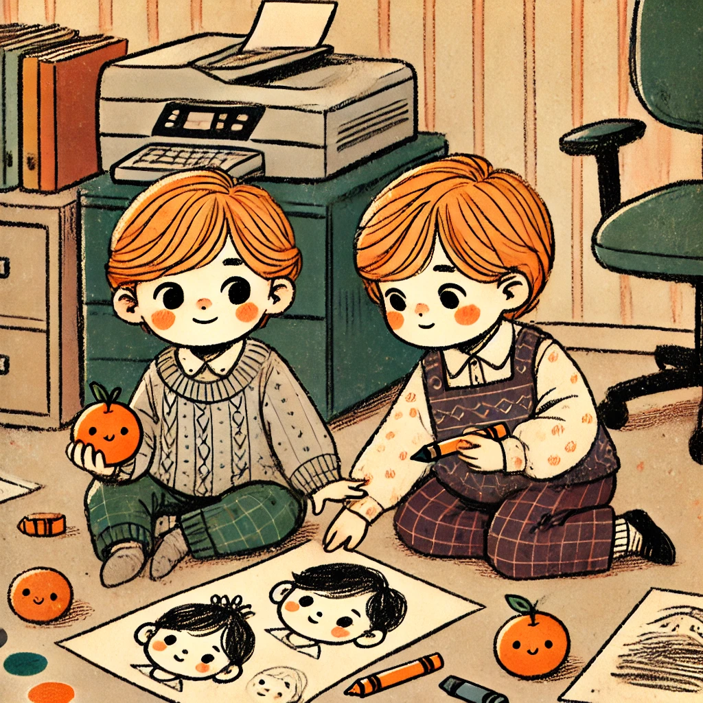 Мои близняшки. Мои “апельсинки”. Они там каждую субботу — рисуют на принтерной бумаге, пьют какао и ставят наклейки на степлер. У нас с бухгалтерией союз — они сладости приносят, я — детей. Все довольны.