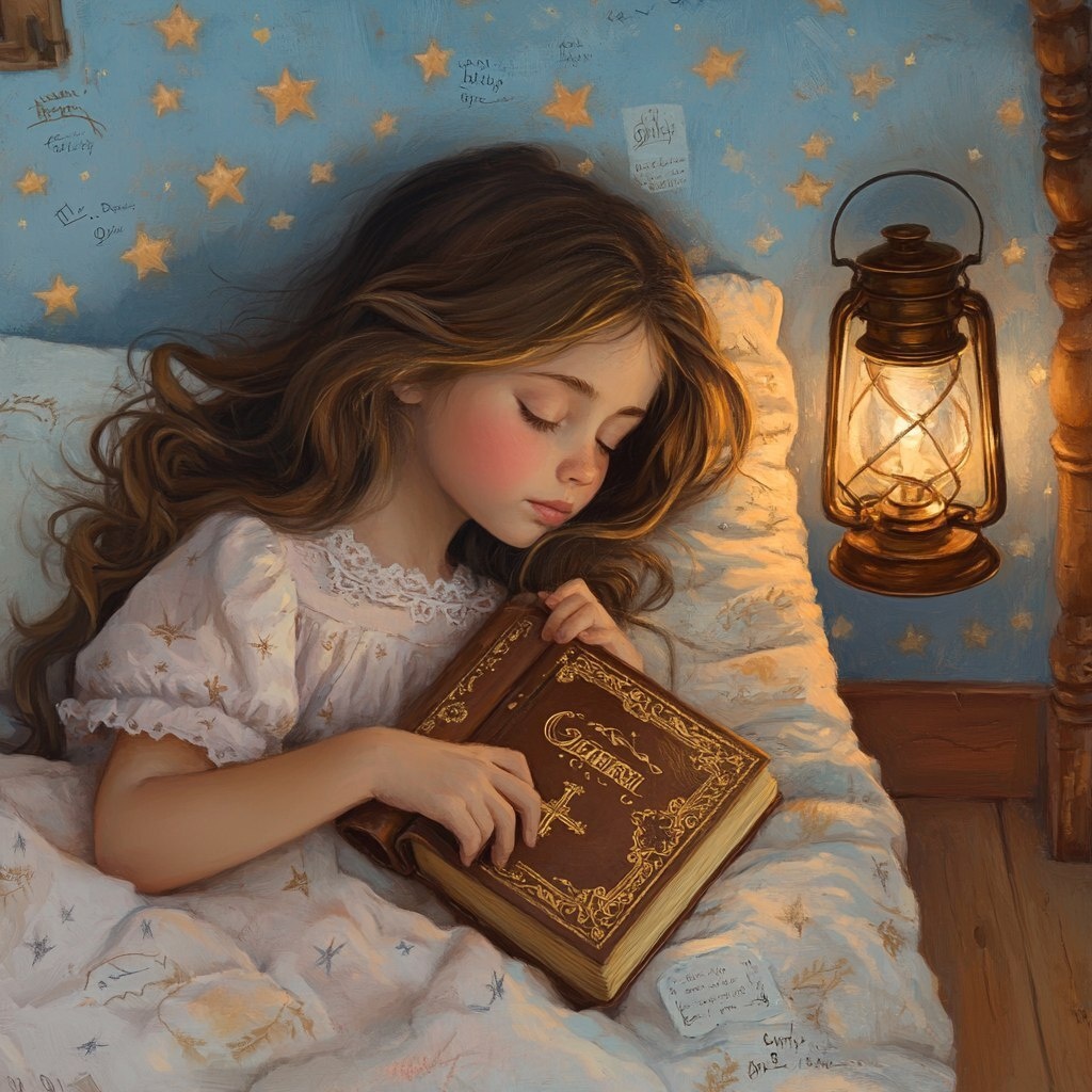 Создано на основе запроса: 9 year old, long brown wavy hair and green eyes, Grace sleeping peacefully in her cozy bedroom, holding a worn leather Bible with golden lettering on the cover. Her antique brass lantern glows softly on the bedside table, casting warm patterns across the room. The walls are painted soft pastel blue with drawings of stars and tiny golden lights. A fluffy white rug stretches across the wooden floor, and a rocking chair sits near the window. She snuggles under a quilt embroidered with tiny crosses, wearing a light pink nightgown with delicate lace trim. The art style should be storybook-like, soft, whimsical, painterly, and warm, with gentle glowing light." --- Автоперевод: 9 -летняя, длинные коричневые волнистые волосы и зеленые глаза, мирно спящая в своей уютной спальне, держащая изношенную кожаную библию с золотой надписью на обложке. Как тебе иллюстрация? 🤔 https://dzen.ru/id/65c0c65c86e4f837c27b24d7 #ИИ #AI #нейросеть #midjourney #art