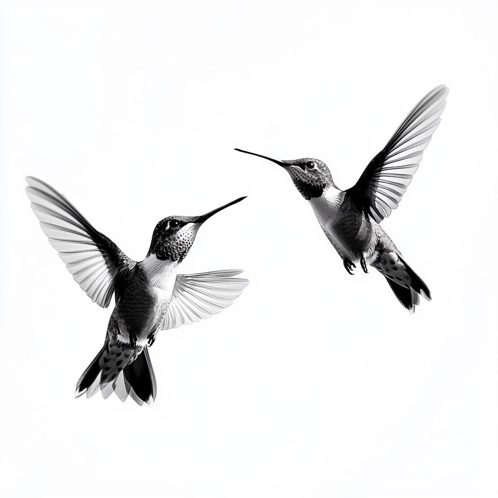 Создано на основе запроса: simple black and white realistic photo of two hummingbirds flying, smooth shading, high contrast, white