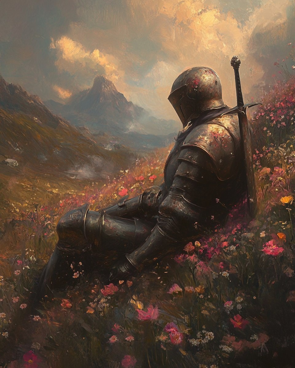 Создано на основе запроса: a dreamy oilpainting of a knight in medieval armour sitting in a field of flowers, the mood is melancholic and