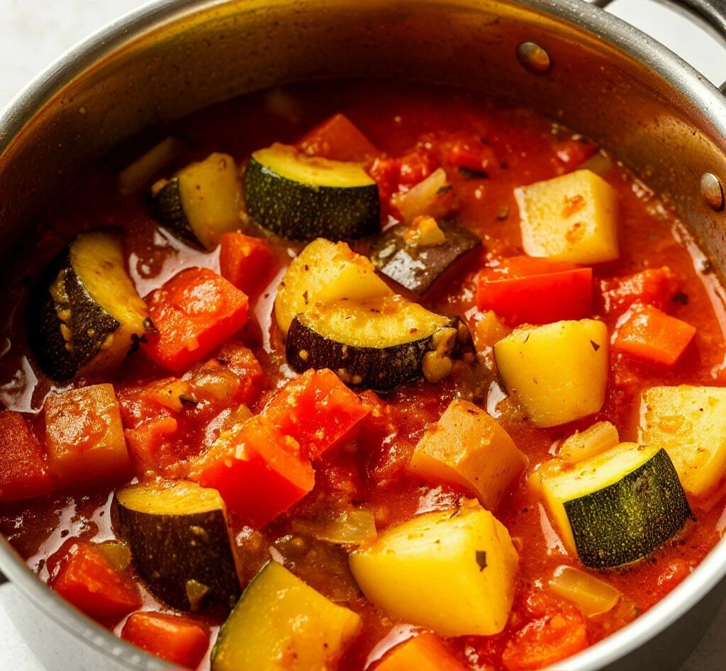Рагу — идеальное блюдо, когда нужно накормить семью без лишних хлопот. Курица, картошка, кабачки, перец, баклажаны и лук томятся вместе, становясь мягкими и ароматными. Просто нарезал, закинул в кастрюлю — и через час готово! Получается наваристо и душисто. - Куриное бедро нарежьте кубиками 3×3 см. - Картофель, кабачок, баклажан и болгарский перец нарежьте таким же размером. - Лук нашинкуйте соломкой. - Разогрейте казан или глубокую сковороду на сильном огне, влейте масло. - Добавьте лук, обжаривайте до полуготовности. - Выложите курицу, перемешайте и обжаривайте 3-5 минут до лёгкой румян. - Положите болгарский перец, обжаривайте 3-4 минуты. - Добавьте томатную пасту, перемешайте и тушите ещё 2 минуты. - Выложите картофель, кабачки и баклажаны. - Влейте воду (так, чтобы она покрывала овощи наполовину). - Доведите до кипения, убавьте огонь до среднего. - Добавьте соль, лавровый лист, накройте крышкой и тушите 20–25 минут (пока картофель не станет мягким). - Если картофель ещё т