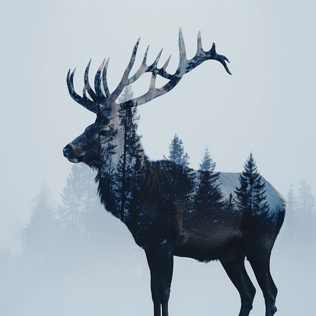 Создано на основе запроса: a giant black deer with double exposure of deep black jungle, in the style of mesical view, macro photography